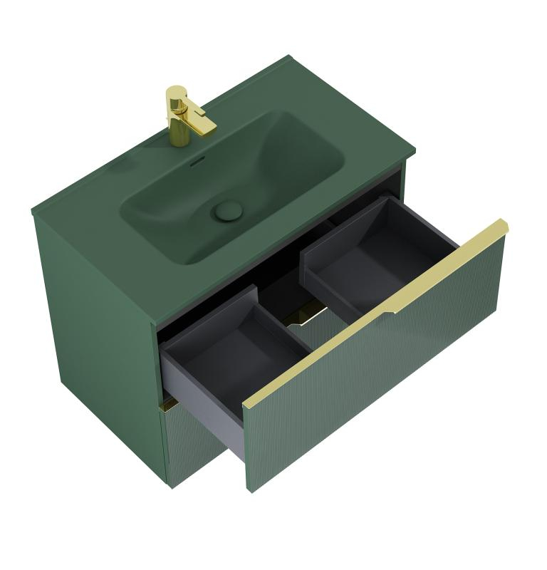 Acest dulap baie 80cm cu 2 sertare verde mat îmbină estetica modernă cu funcționalitatea superioară, fiind ideal pentru cei care caută mobilier de baie elegant și practic.