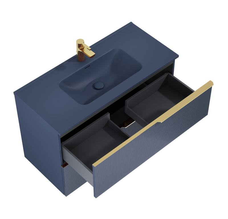 Acest dulap baie 100cm cu 2 sertare navy blue mat îmbină estetica modernă cu funcționalitatea superioară, fiind ideal pentru cei care caută mobilier de baie elegant și practic.